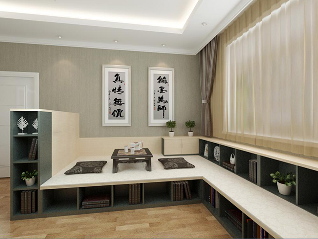 如果你家的飄窗面積足夠大。采光、通風、視野都很好,那你可以把飄窗設計成一個多功能的休閑區。這樣的飄窗相對來說比較普遍,客人來了可以坐在著喝喝茶聊聊天,視野寬闊,生活雅致而又韻味。