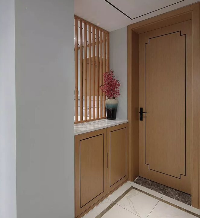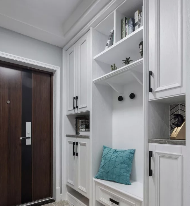 嵌入式鞋柜一般是和進門吊頂結合設計的,不僅美觀實用而且可以大大節省室內空間。利用墻面的空間,在考慮墻體的承重范圍下,在玄關處設計嵌入式鞋柜,能夠保證鞋柜足夠安全。