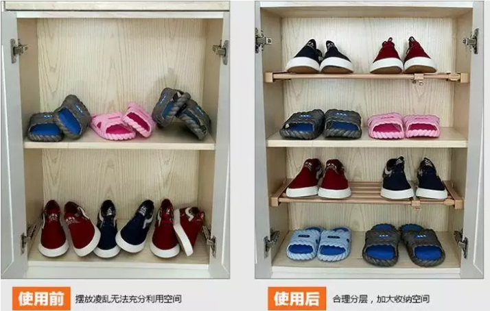 可調節層板的實現方式有很多種,小編最推薦的是使用伸縮桿,一層變兩層,高度可以根據鞋幫高度來調整。