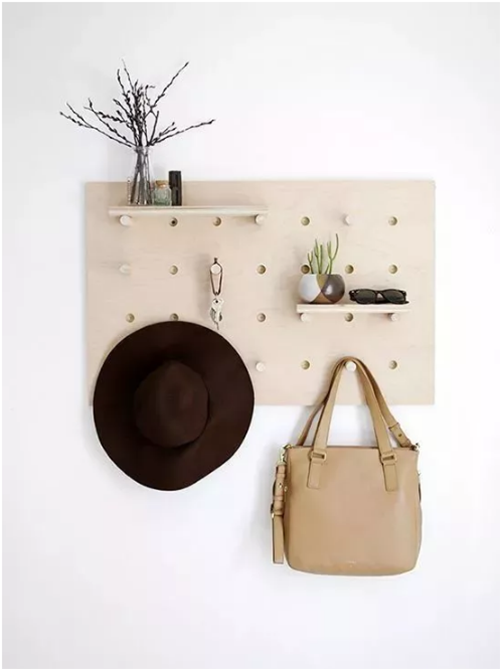 ▲有實際收納功能的洞洞板就十分適合放在玄關處,與隔板結合,兼顧裝飾與收納。