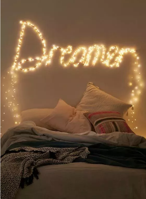 用串燈裝飾房間端端已經介紹過很多次啦,用星星燈在床頭固定出一個具體的形狀來做裝飾,或者干脆做個照片墻效果也不錯。