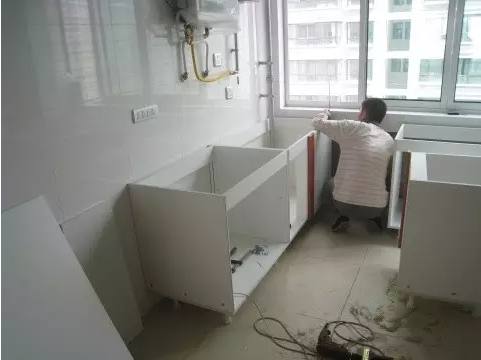 3、進(jìn)行櫥柜、油煙機(jī)等炊具的安裝,水槽(上下水件稍后安裝)和煤氣灶也要跟上,記得通知物業(yè)開(kāi)通煤氣測(cè)試一下。