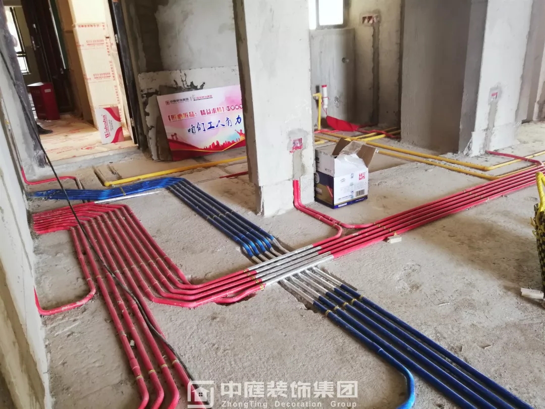 施工現場線管鋪設橫平豎直,按照集團施工規定使用鐵皮卡扣固定,管和管之間留有足夠縫隙,以便鋪設地磚時水泥砂漿進入管下,避免地磚后期出現空鼓;強弱電交匯處,用錫紙包裹保護,可以有效防止對弱電產生信號干擾。