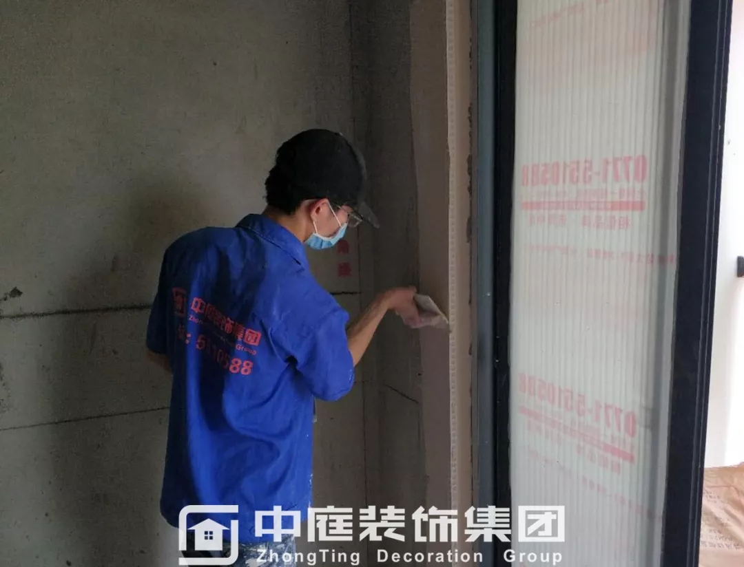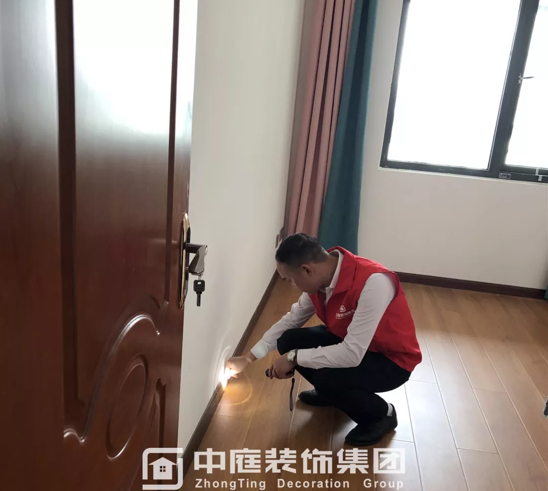 利用強光手電筒檢查墻面平整度及陰角是否達到集團施工標準