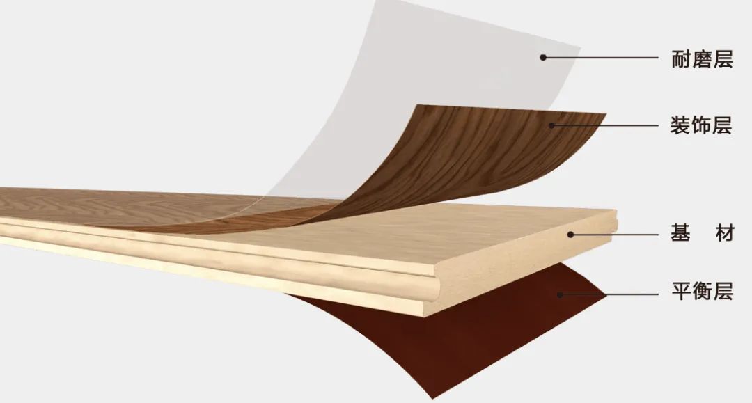 強化復合木地板一般有四層,耐磨層、裝飾層、基材層、平衡層。