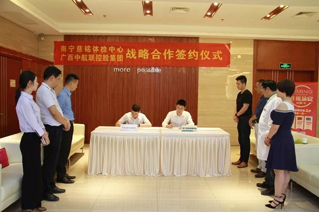 4月13日下午,中航聯控股集團公司與南寧慈銘體檢在南寧慈銘體檢中心,就雙方達成戰略合作關系進行正式簽約,并將慈銘體檢中心列為集團指定體檢機構。