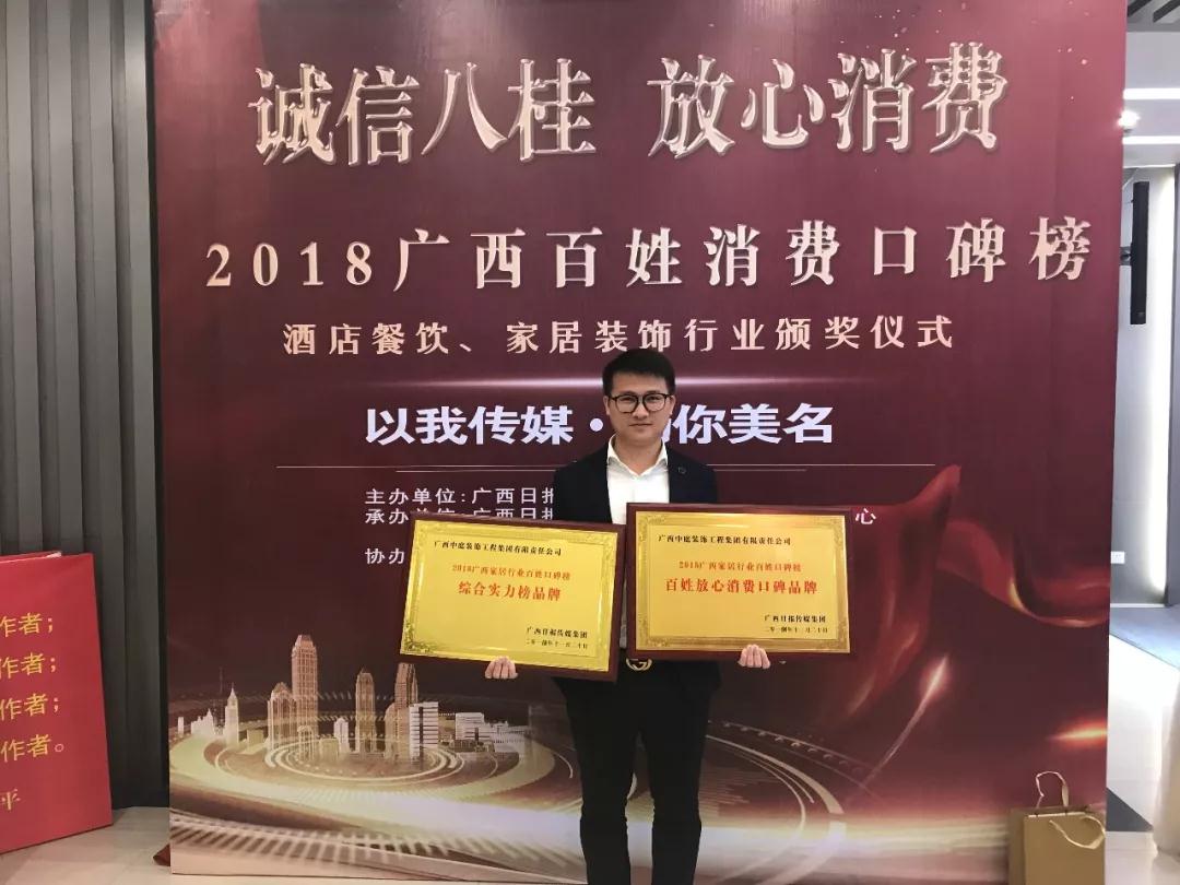在2018廣西百姓消費口碑榜中,中庭裝飾集團榮獲百姓放心消費口碑品牌獎綜合實力榜品牌獎”,由南國早報副總編輯趙永勝南國早報副總編輯鄧志勇為其頒獎。