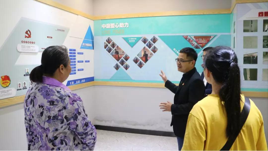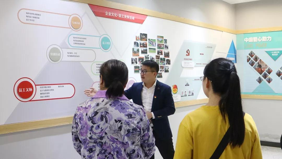 ▲會前集團領導帶領社區黨委許書記等人參觀集團文化長廊