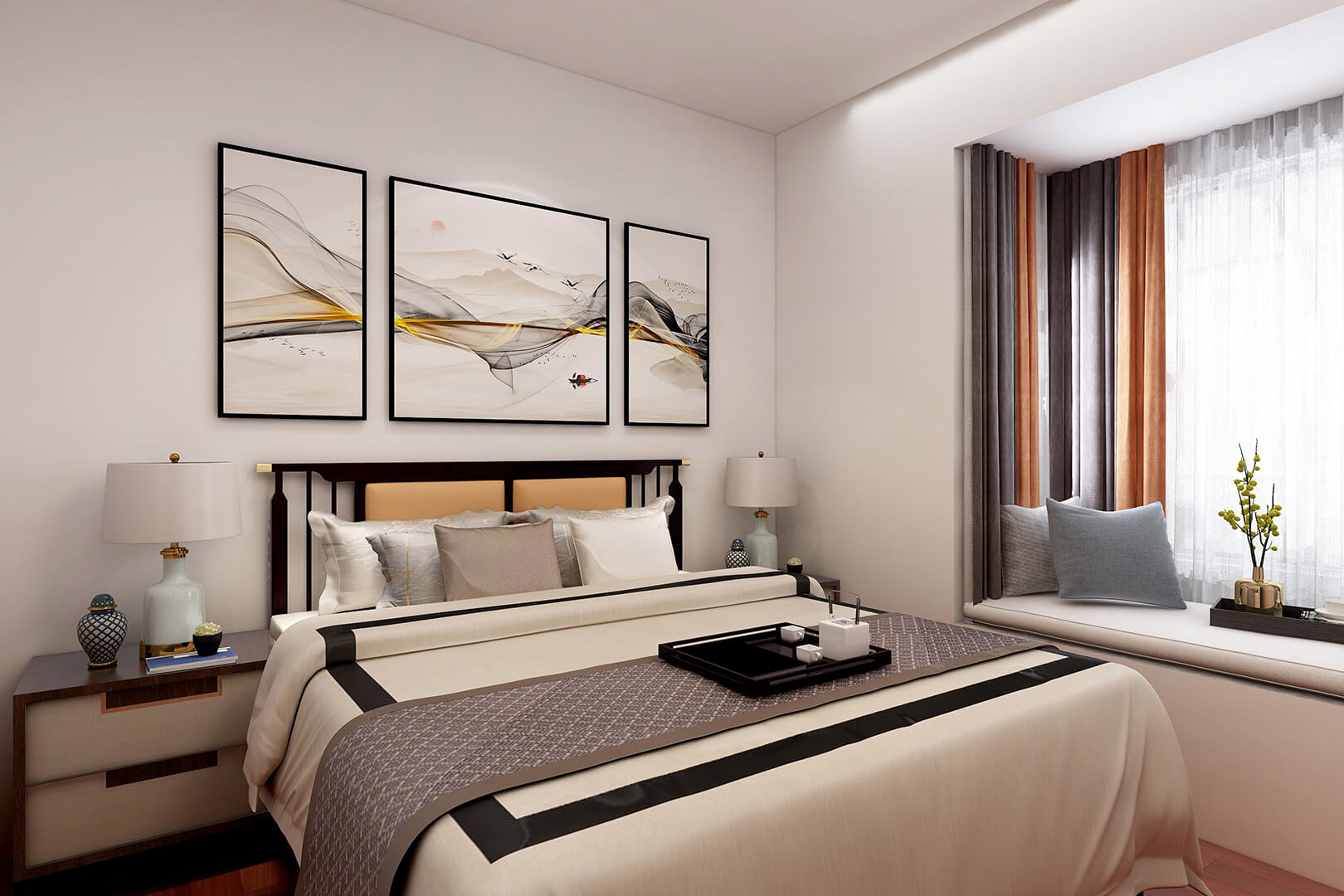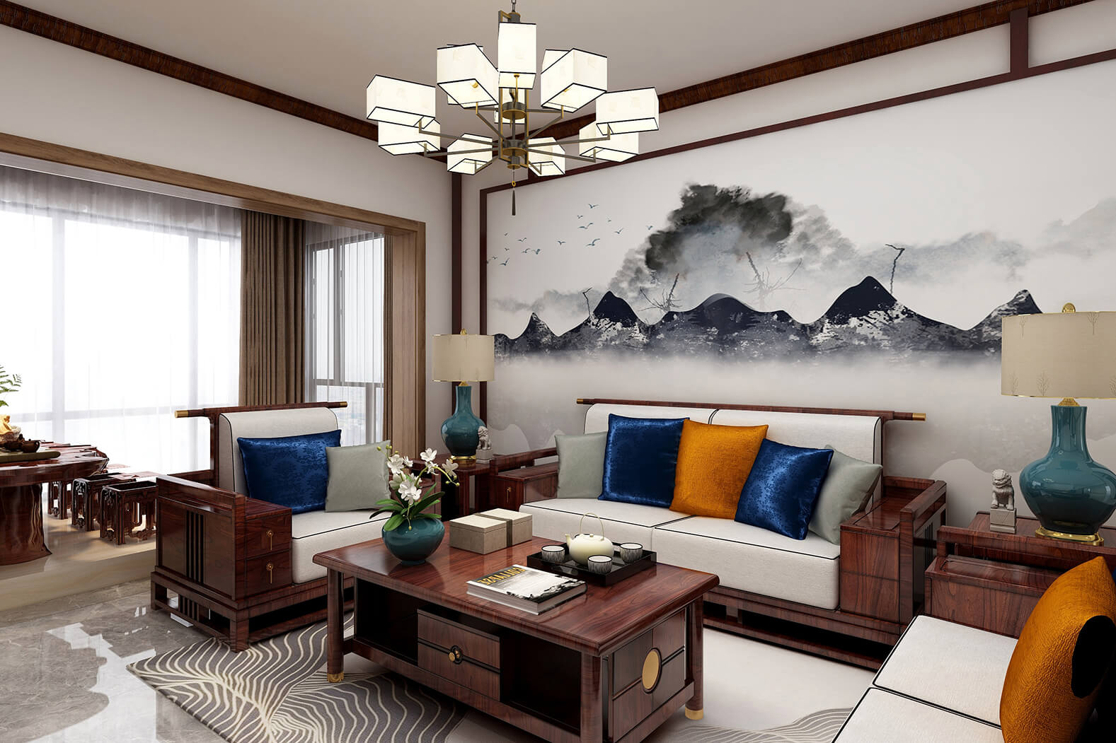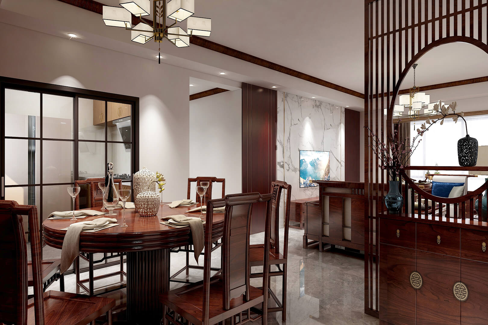 本案戶型為:5房2廳3衛,總面積121㎡。素雅的空間背景,端莊大氣的木系家具,呈現出雅致的特色,中式元素的裝飾給人帶來自然古雅的視覺效果,整體空間給人寧靜致遠的感覺。