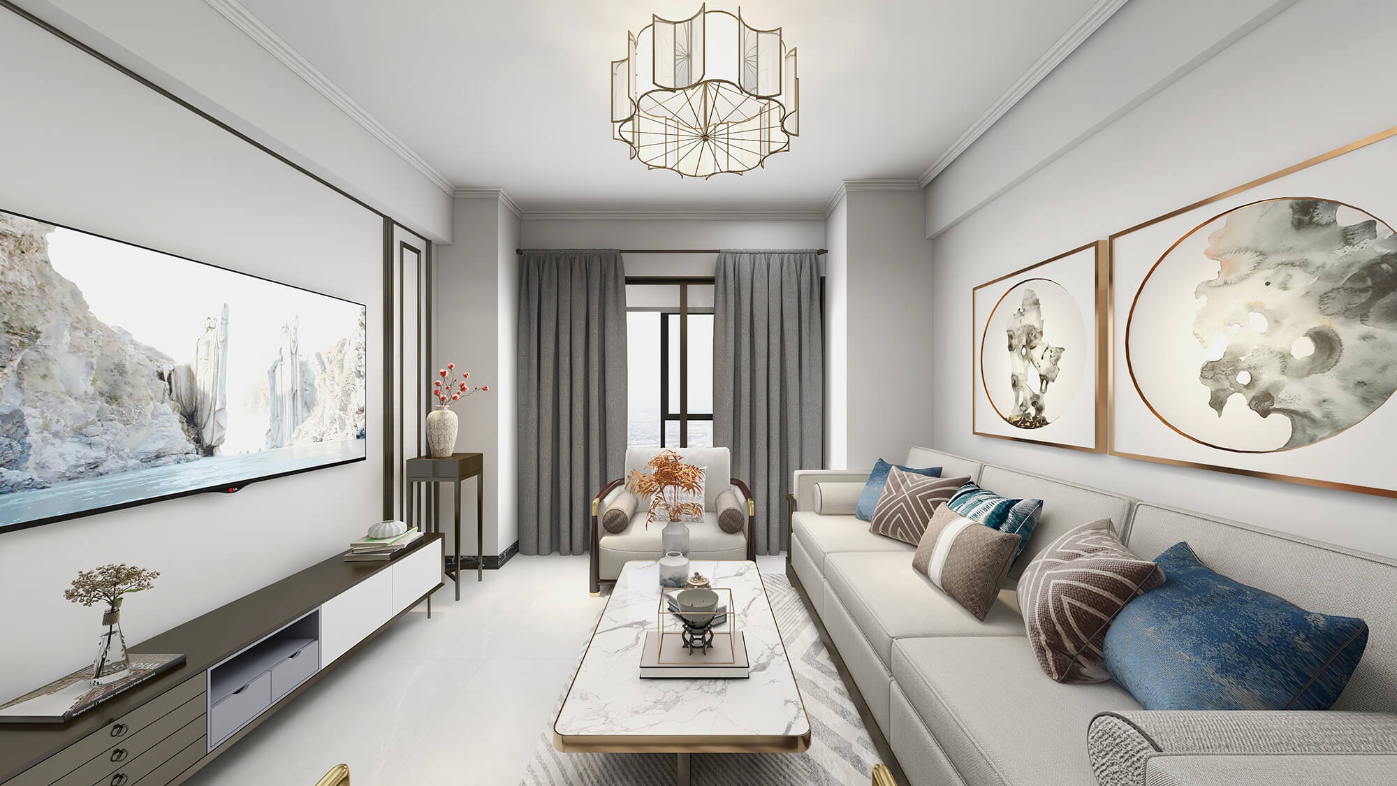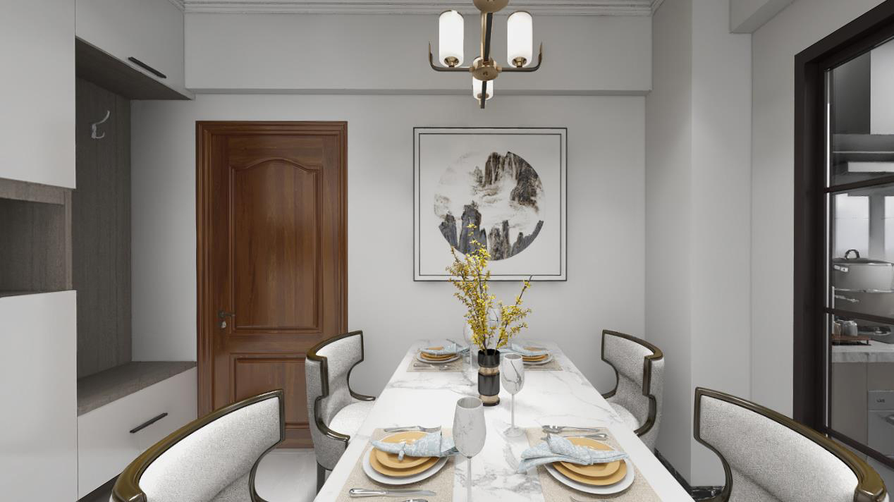 本案戶型為:3房2廳2衛(wèi),總面積72㎡。本案風格為新中式,在空間中以淺灰色為主色調,將中式元素以生活的面目表達出來。在造型、擺件等上面采用一些中式手法,為空間增添高雅秀逸的意境美,使得整體空間賞心悅目,并充滿韻味。