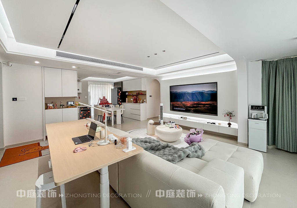 這套房子的裝修風格屬于現代奶油風格。整體以純凈的白色為主色調,營造出簡潔明亮的空間感。線條設計極為流暢,如拱形門洞、無主燈的線性燈帶,弱化了復雜裝飾,凸顯極簡美學。