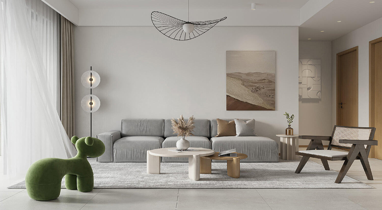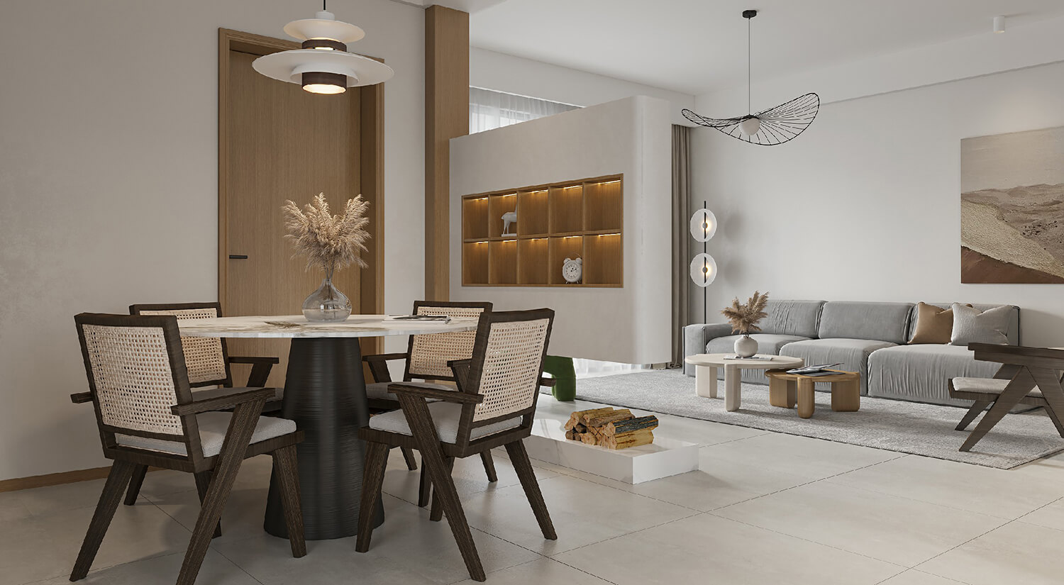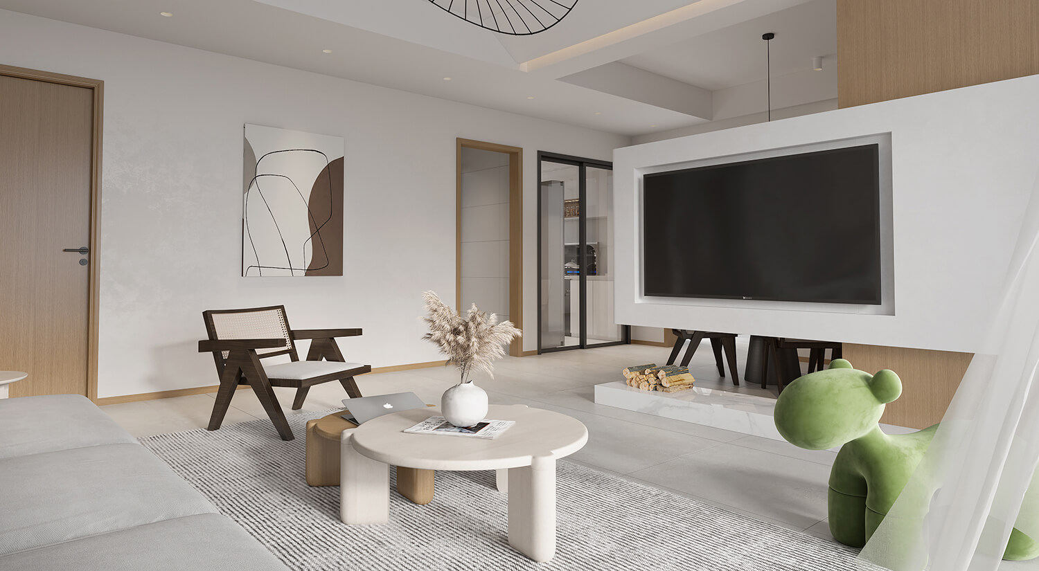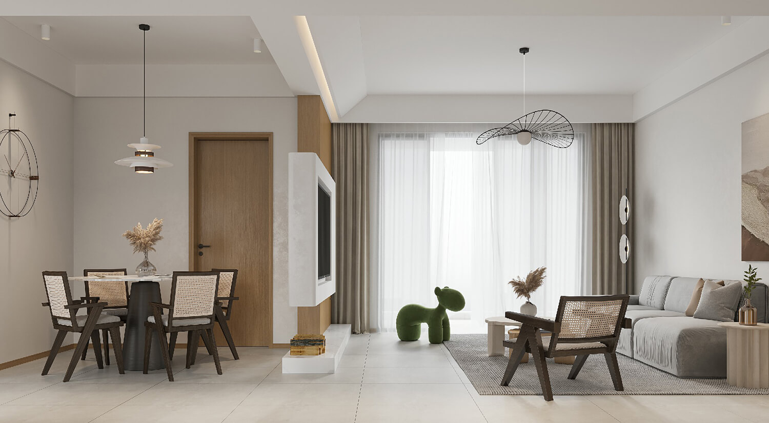 本案屬于現代簡約風格。客廳采用無主燈設計,更具簡約時尚感。客餐廳布局合理,客餐廳通鋪淺灰色瓷磚。使空間更加開闊明亮,增加空間美觀度。