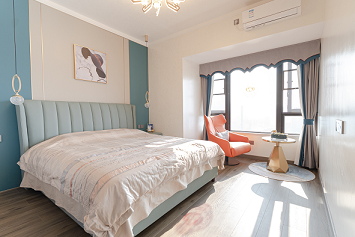 主臥的套房設計,主臥,衣帽間,書房一體化可以給業主更強的居住獨立性以及舒適感。整體延續了客廳的風格,白色與綠色之間的碰撞,與客廳互相呼應,橙色的懶人椅作為整個空間的點綴色。照明以主燈加上床兩側的吊燈做陪襯,讓整個空間顯得很有層次更有情調。