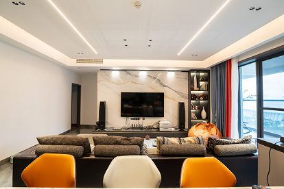 電視背景墻選用木飾面及巖板,質感柔和,地面用同色系深色些的瓷磚,讓空間更有層次感。