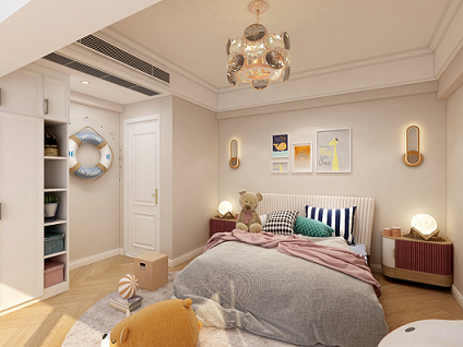 整個空間主要在軟裝搭配上做文章,運用比較童趣的掛畫,掛件等裝飾,讓空間生動活潑起來。