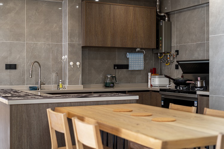 3.廚房:開放式廚房與客廳互為連通又相對獨立,中西廚合并與島臺的設計滿足烹飪需求。