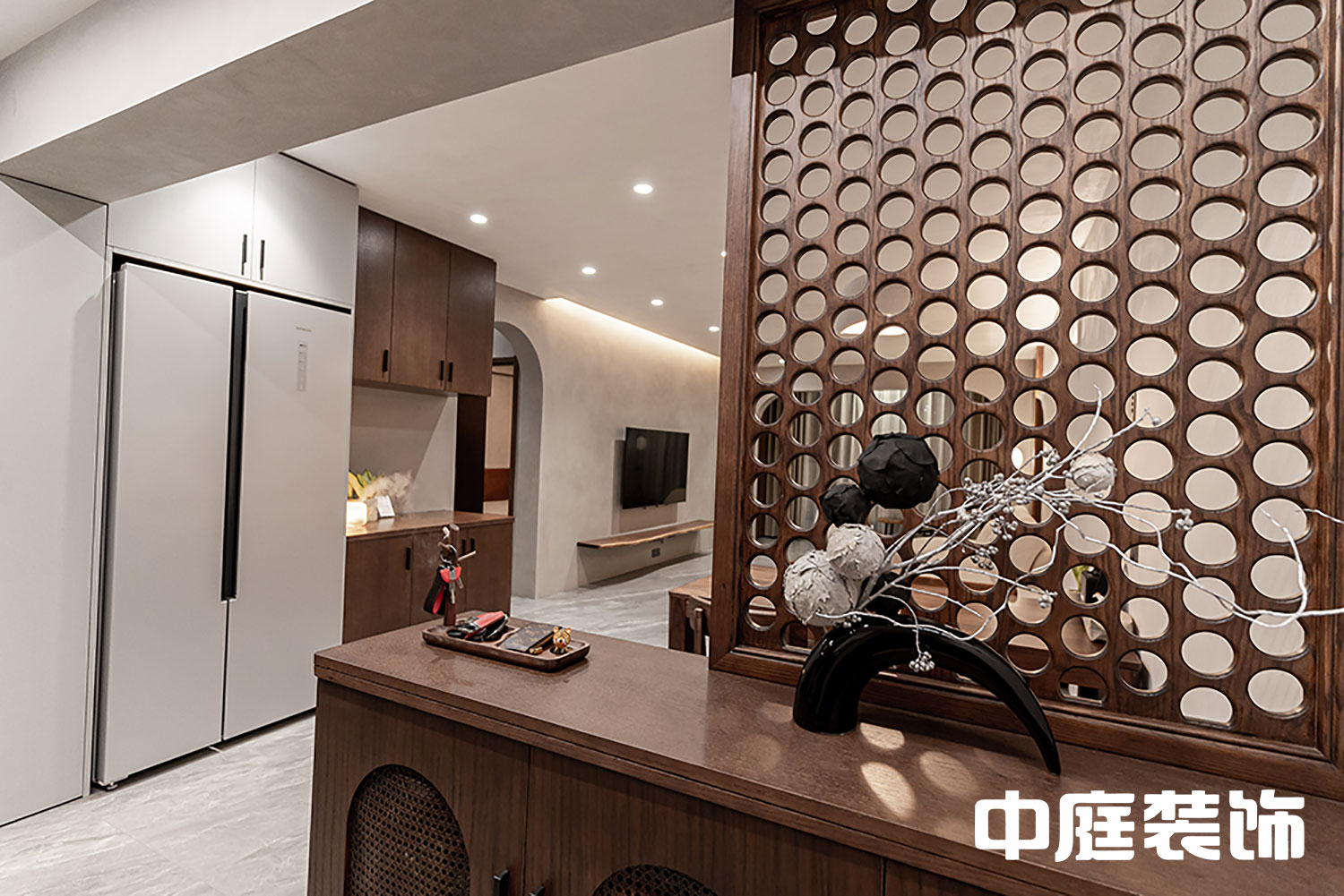 ‘T’字動線非常合理,入戶鞋柜設計避免開門一覽無余的尷尬,更利于保護業主的私密性。在風水也避免了穿堂煞。